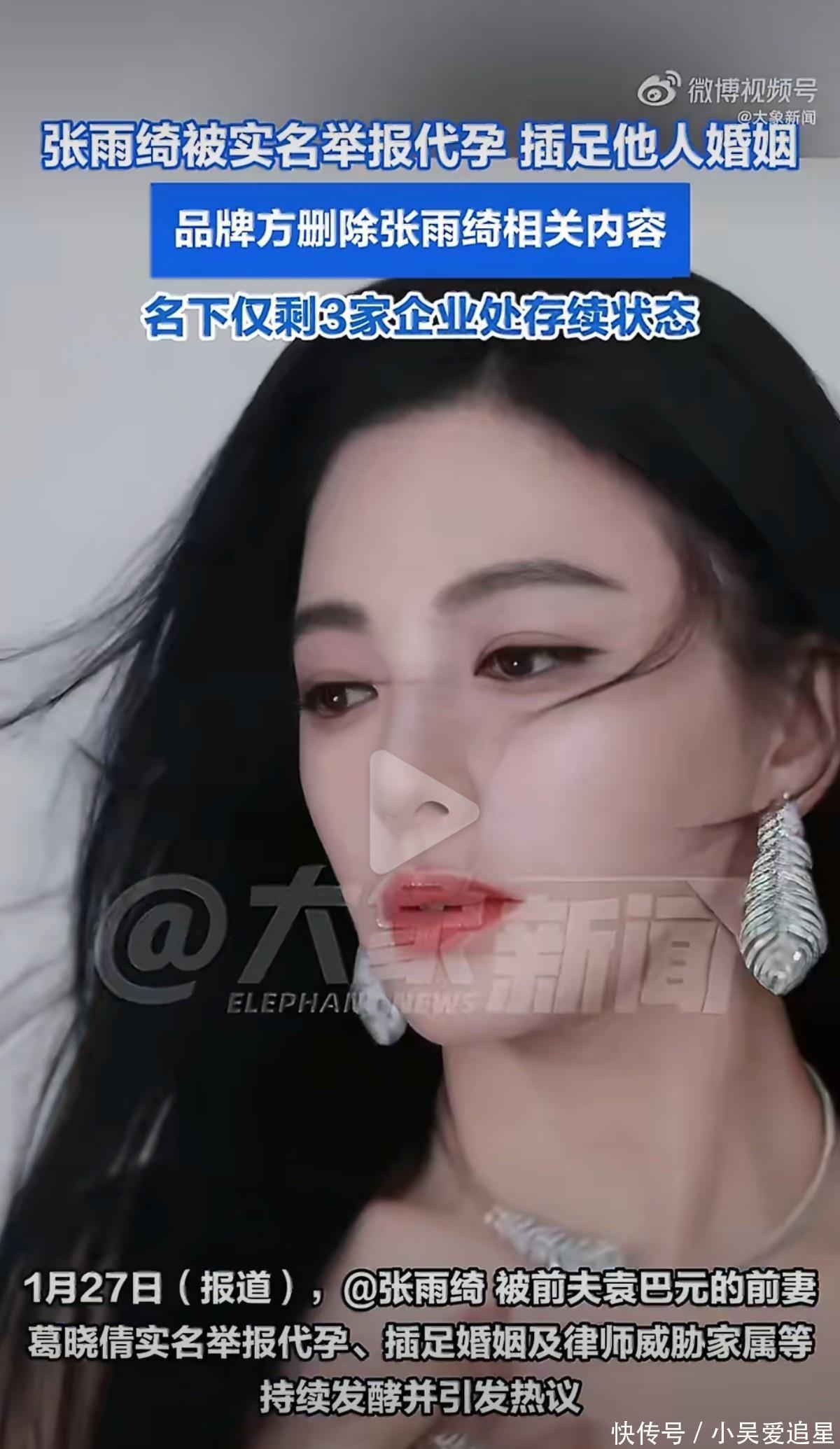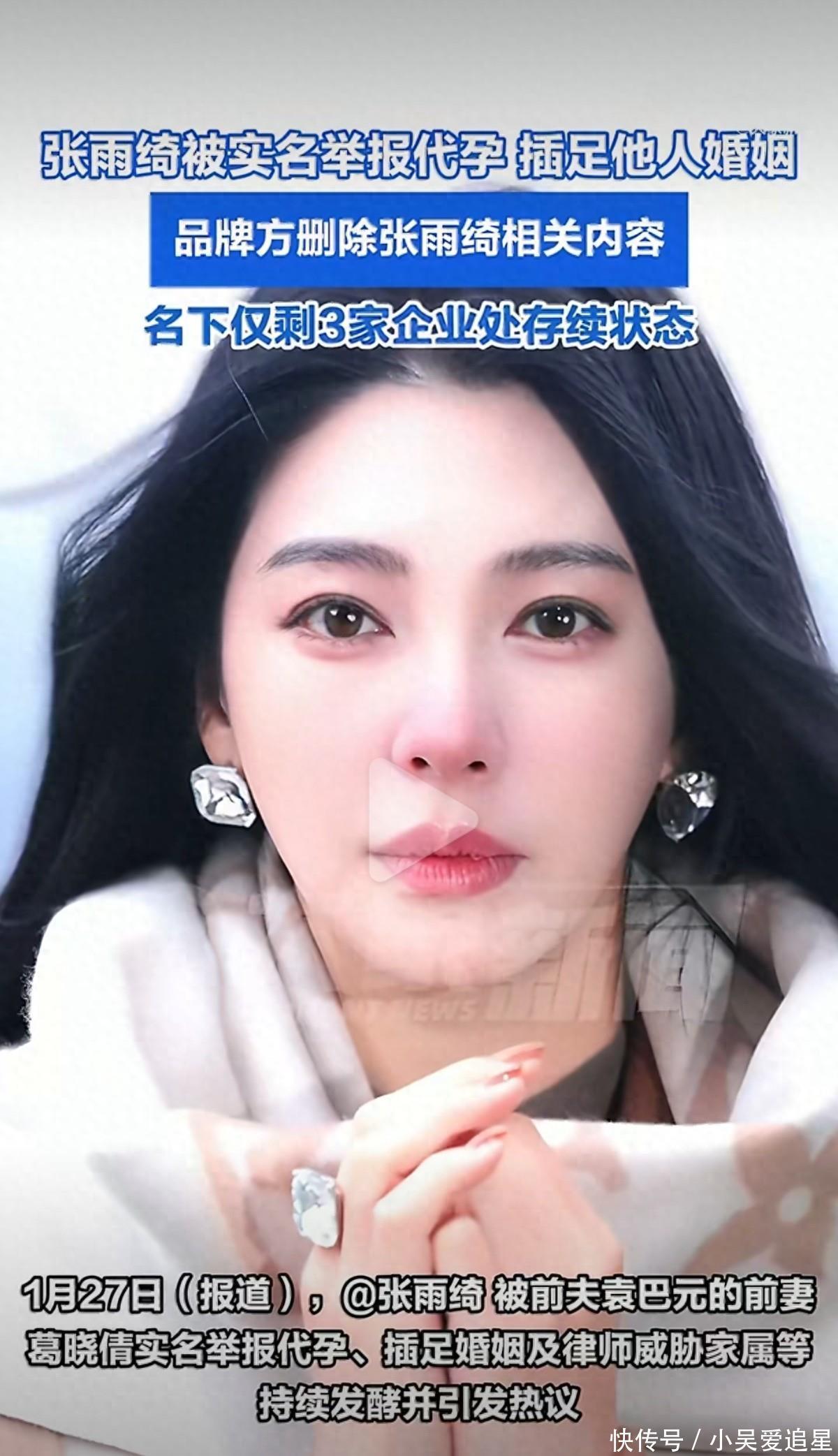 近日,演员张雨绮被前夫袁巴元的前妻葛晓倩实名举报涉及代孕、插足婚姻等争议,事件持续发酵,已导致其多个商业代言受到影响。