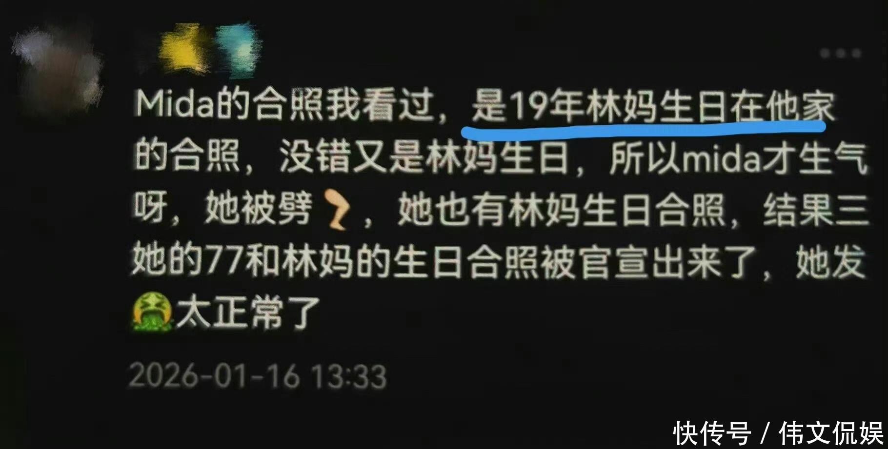 时间线的迷雾中,藏着最刺眼的矛盾。Mida紧贴林母肩头的庆生照、2023年的贴脸自拍,与现任七七2023年初转卖演唱会门票、年底经友人介绍相识的爆料形成闭环,即便经纪公司将2019年合照修正为2023年拍摄,仍无法解释"普通朋友"为何连续四年出现在私人家庭聚会。更具讽刺意味的是"77"巧合:Mida账号后缀的"7777"与现任昵称"七七"撞车,两位女性均以亲密姿态亮相林母寿宴,让"林母成打卡景点"的调侃,成为人设崩塌的生动注脚。