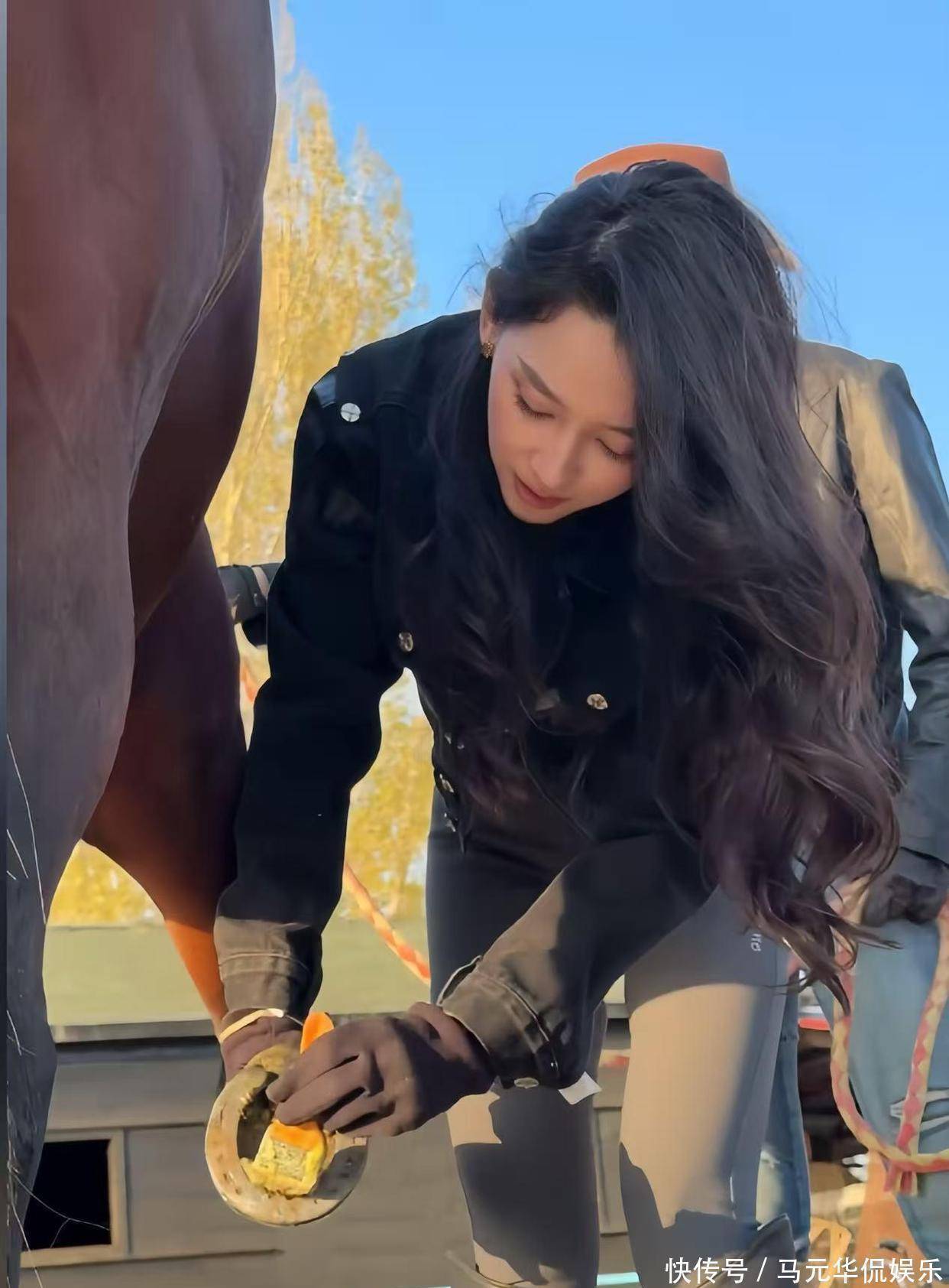 最让人印象深刻的是护理环节。 森林北没有丝毫犹豫,蹲下来就给马蹄冲洗,然后拿出专业工具将马蹄缝里的马粪铲得一干二净。 完成清洁后,她还为马蹄刷上一层保护油,专业程度不输马场工作人员。 整个护理完成后,森林北牵着小马在马场悠闲溜圈,画面温馨和谐。视频中一个意外插曲是森林北的穿搭引发的尴尬。 为方便骑马,她选择了一件皮衣和紧身裤。 然而因近期体型略显丰腴,紧身裤在三角区显得过于紧绷,造成尴尬视觉效果。