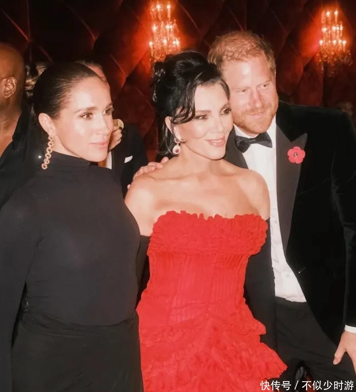 7. 被移除的照片内容颇具看点:其一是44岁的卡戴珊与梅根对视微笑的合影,背景中哈里正与其他宾客交谈;另一张从詹娜背后取景,梅根一手轻搭寿星肩头,哈里则面向镜头调皮地做出鬼脸;还有一幕定格了梅根即将拥抱Netflix创始人里德·黑斯廷斯的瞬间。