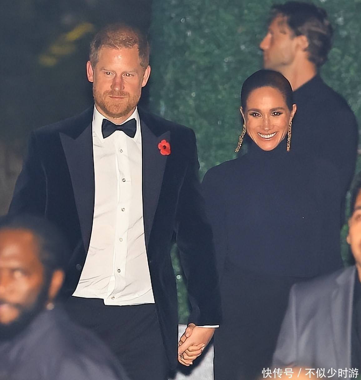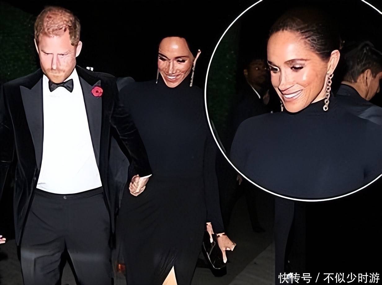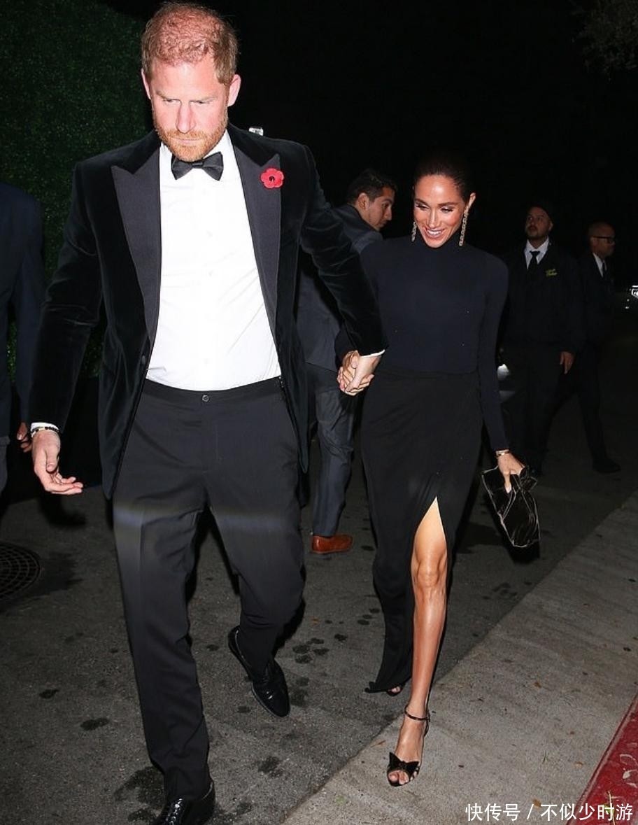 5. 狗仔镜头记录下了两人抵达现场的画面——41岁的哈里身着黑色燕尾服搭配经典领结,神情略显凝重;而梅根则依偎在他身旁,面带灿烂笑容,携手步入灯火通明的豪宅。