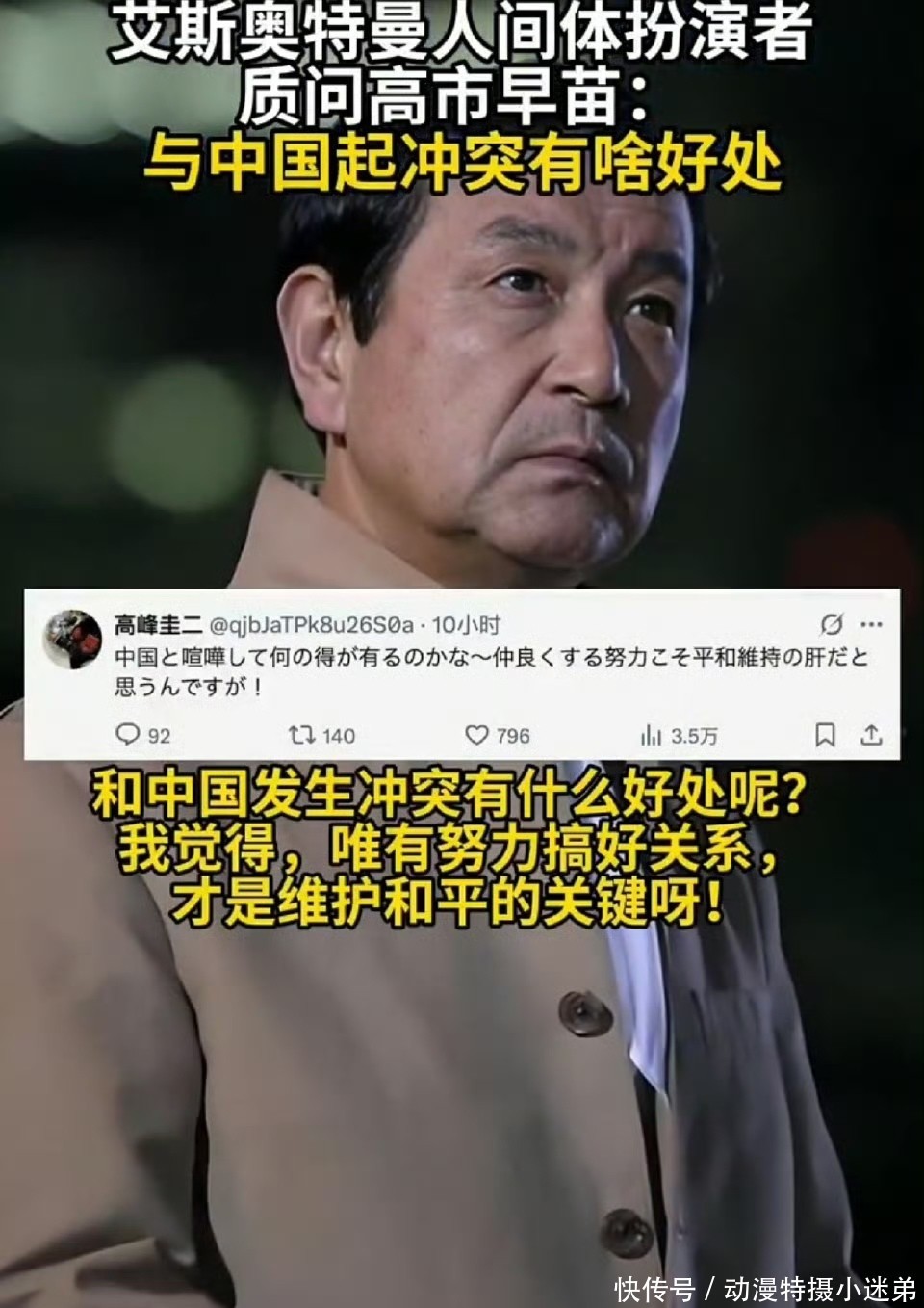主要是因为高市早苗的不当言论,已经引起日本普通民众的抗议。而作为艾斯奥特曼的人间体,北斗星司的扮演者高峰圭二老爷子,在社交平台公开质问日本首相高市早苗的涉台言论“我不明白与中国起争执有什么好处?我认为维护和平的关键在于努力彼此和睦相处”!正是因为这个言论发表后,才让大家觉得高峰圭二就是戏外的光之战士,也因此有了奥特曼都看不下去的言论。