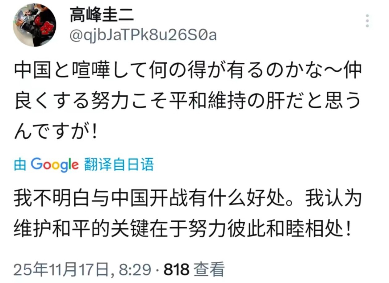 对于高市早苗的不当言论事件,看看后续的发展。但是对于高峰圭二老爷子,竟然能够勇敢的站出来?这确实是挺让人敬佩的。他就好像是真正的北斗星司一样,并且也非常符合这个角色的名言“热忱之心不可泯灭,要帮助弱小者,四海之内皆是朋友”。其实高峰圭二老爷子,一直以来都是反战派,并且是数十年如一日的坚持立场。